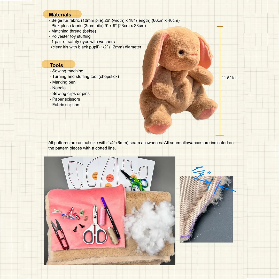 With our Stuffed Bunny Plushy Toy Sewing Templates & Instruction kit, you have the flexibility to choose between hand sewing or using a sewing machine to bring your cuddly bunny to life. Whether you prefer the meticulous detail and personal touch of hand stitching or the efficiency and precision of a sewing machine, our comprehensive instructions cater to your preferred method of crafting. Whether you're a seasoned seamstress or a novice crafter, our versatile kit ensures that crafting your own bunny plushy is an enjoyable and rewarding experience, no matter your preferred sewing method.