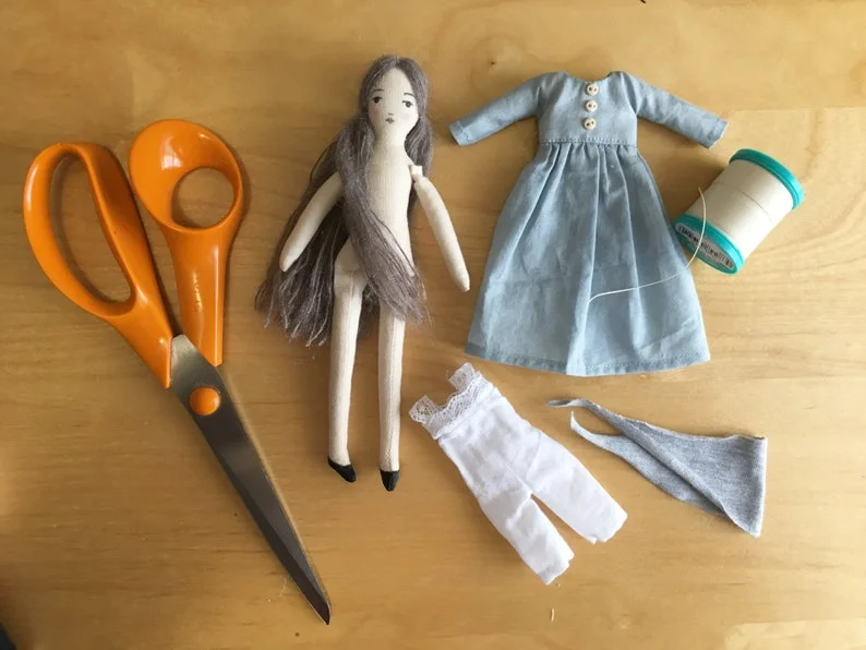 Don’t let her size fool you — this lady comes with a full wardrobe! You’ll sew up a tiny dress, a delicate apron, some old-fashioned bloomers, a classic hat, and even some modern undies (because yes, she’s fashionable and practical). Think of it as the doll version of a vintage runway show, but in miniature. 💃🧢🩲