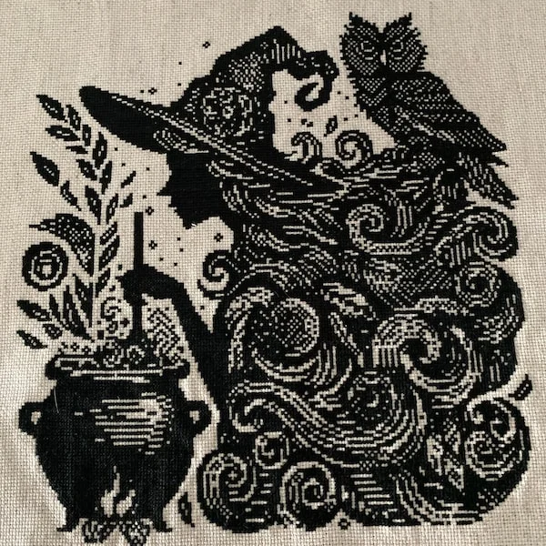 Unleash your inner witch with the Woodcut Witch Cross Stitch Kit. This haunting design features a spellbinding silhouette, a bubbling cauldron, and a wise owl perched at her side—all in striking black-and-white woodcut style.